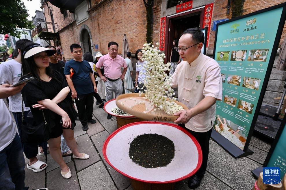 6月14日,非遗传承人(右一)在福建非遗主会场活动中展示福州茉莉花茶窨制技艺。