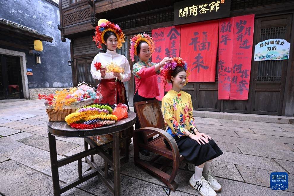 6月14日,非遗传承人黄丽泳(中)在福建非遗主会场活动中展示泉州蟳埔女“簪花围”发饰。